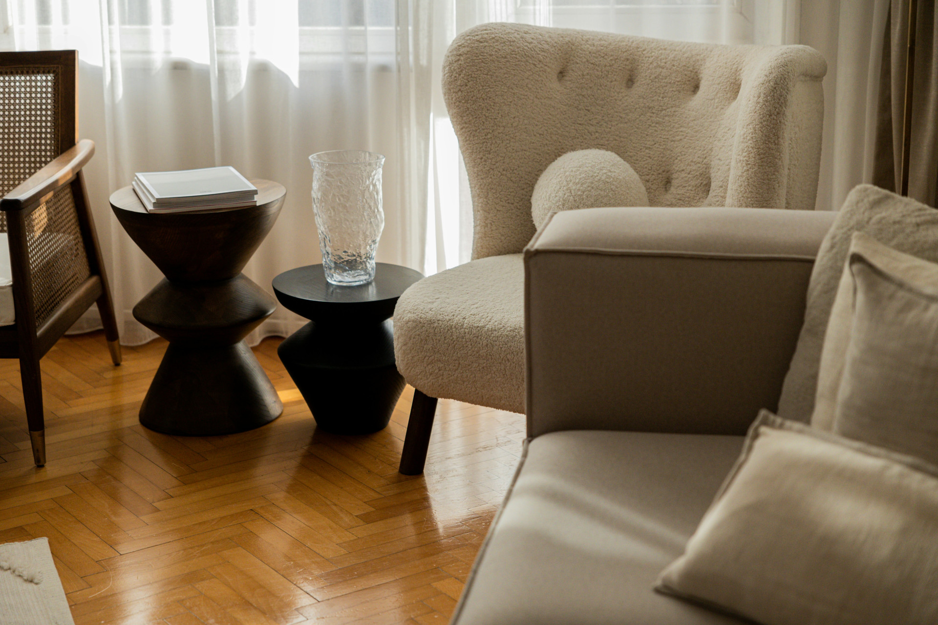 - Bouclé-Stoff in Beige: Verleiht eine weiche und strukturierte Oberfläche mit modernem Ausdruck.